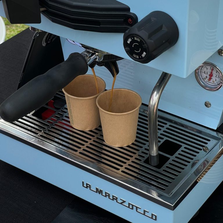 Neben unserem Eis-Mobil bringen wir mit der himmelblauen La Marzocco Linea Mini R erstklassiges Barista-Feeling direkt zu euch.